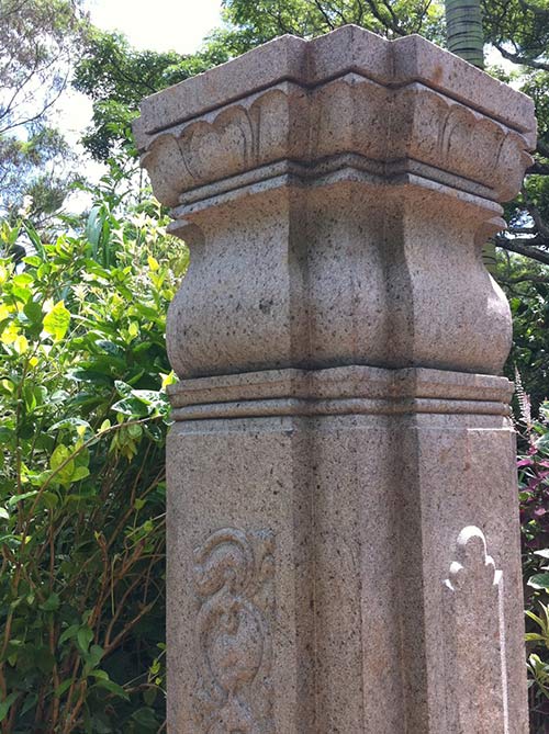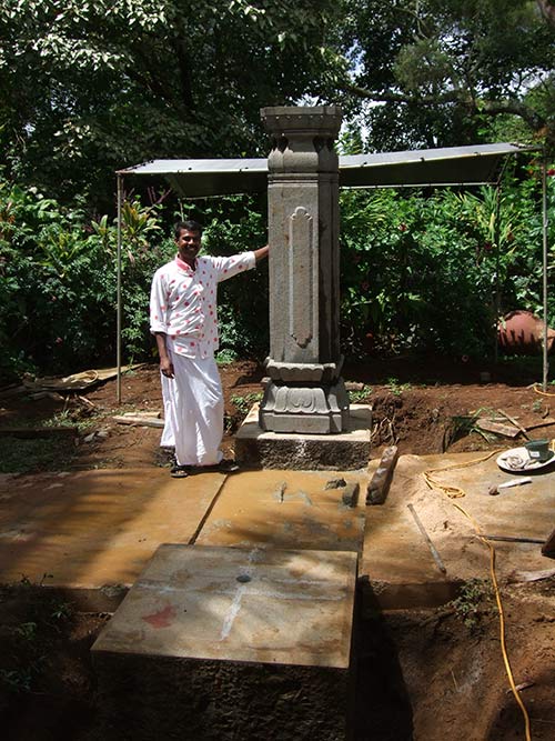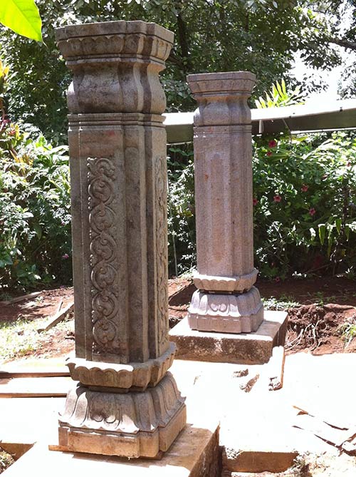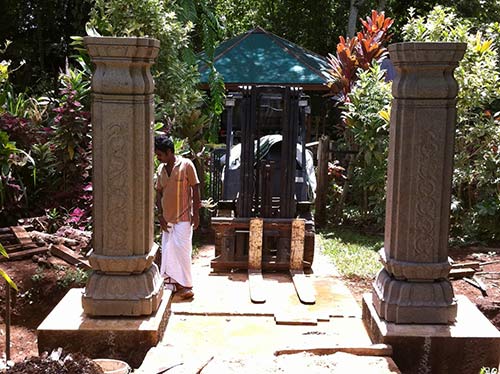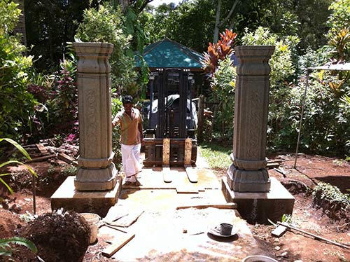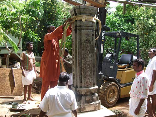 Yes! it's finally happening! The monastery entrance archway is being installed. Yoginathaswami and the silpis continued their work today. Here they've installed one of the pillars with the help of the forklift.