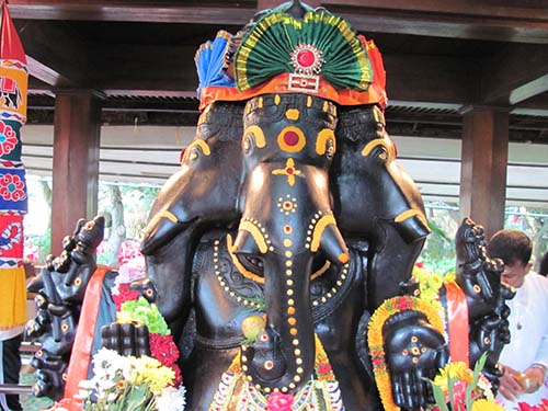 Ganesha Chaturthi is the main grand public religious festival at the Spiritual Park of Mauritius. Sishyas were at the Park on two days before to complete final preparations for the grand Ganesha Chaturthi celebration. karma yogis attended to several works like cleaning rock walls and pathways with water pressure, decorating with tombai and tornums hangings, polishing puja brass items and decorating the large granite Pancha Mukha Ganapati murti. Here is the murti just newly dressed.