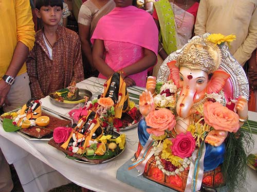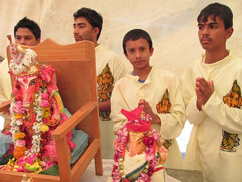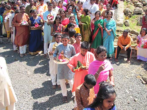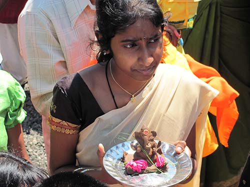 Participants line up and preparing to carry their Ganeshas for the procession...
