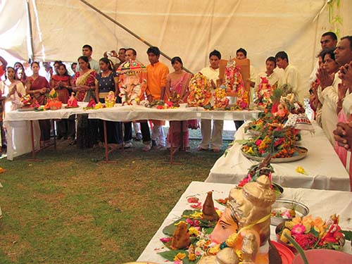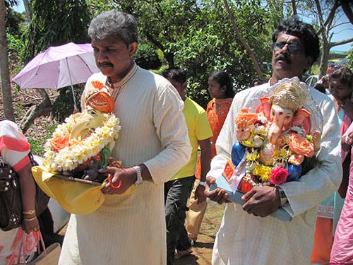 We complete the Ganesha Chaturthi series of photos from Mauritius with a few photos of the Visarjana or immersion ceremony of clay Ganesha murthis at the Spiritual Park. Here is a nice youth team getting ready for the visarjana procession.
