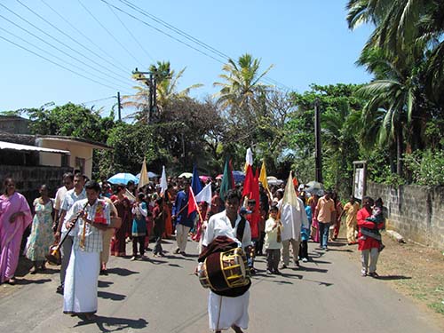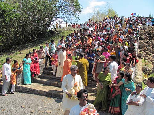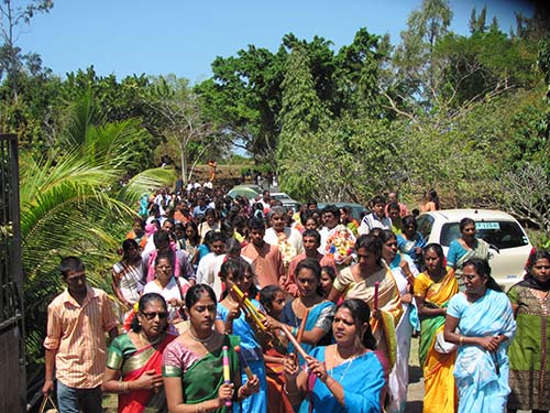 Devotees leaving the premises of the Spiritual Park for the village of La Pointe.