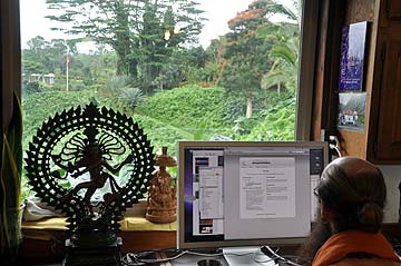 Senthilnathaswami was dislodged from his desk by our renovation work, but beautifully letting the river of live take him, he ended up with the best view we know of.