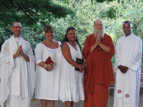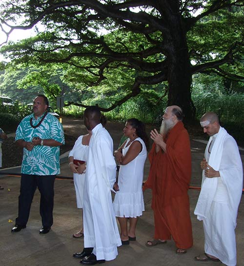 The Catholic priest said a prayer, our monks invoked Lord Ganesha and did a small arati and broke a coconut and two Hawaii Christians, said prayers from the Hawaii, Christian Bible.