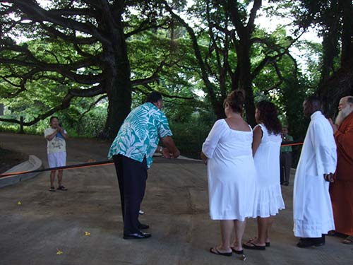 In a very small and local ceremony, Sivakatirswami and Sadhaka Tejadevanatha join with several other island clergy to bless the opening of a small bridge over the Kapaa stream in the Hauula Valley on the north side of Kapaa town.