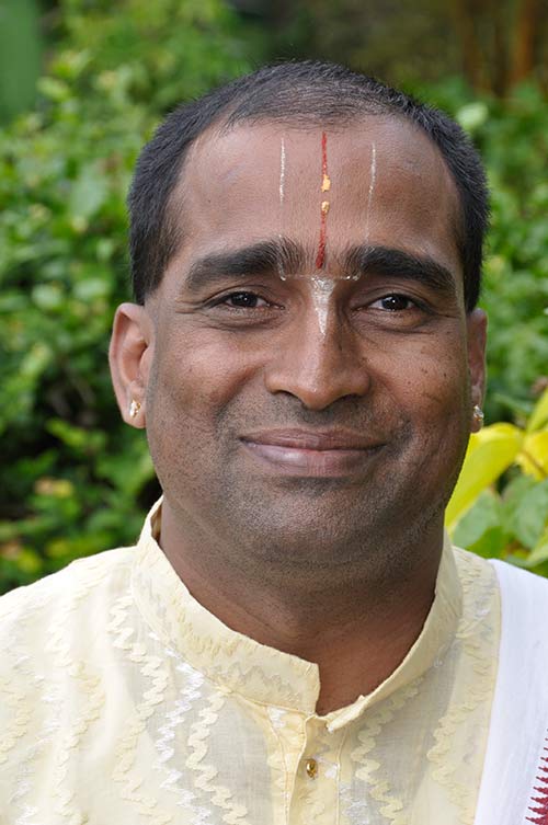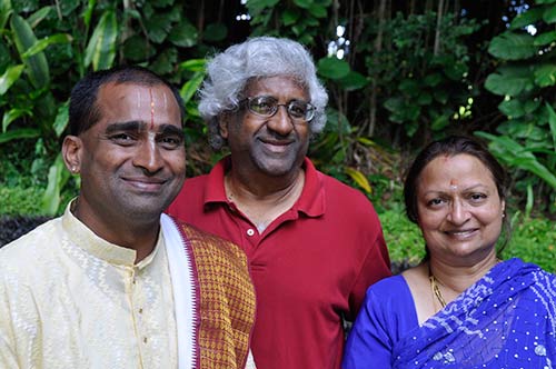 On the left, is the priest Venkatachalapathi Samudrala who was trained in Tirupati, and is now serving in Bakersfield, California. He is here on Kauai to perform a wedding and is delighted to come to the Aadheenam with members of the wedding party who are sponsoring his trip.