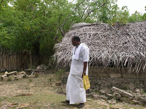 After Swami's Maha Samadhi devotees of Mandaitheevu maintained the small hut and performed pujas there. In 1982 I visited the hut. During the last two decades, the entire population of Mandaitheevu was forced out as this area remained in the war zone. Now people have been allowed slowly to return to the island and people are rebuilding their lives there. Last month I went to Mandaitheevu in search of Swami's hut and saw that the land was overgrown and the hut was destroyed.