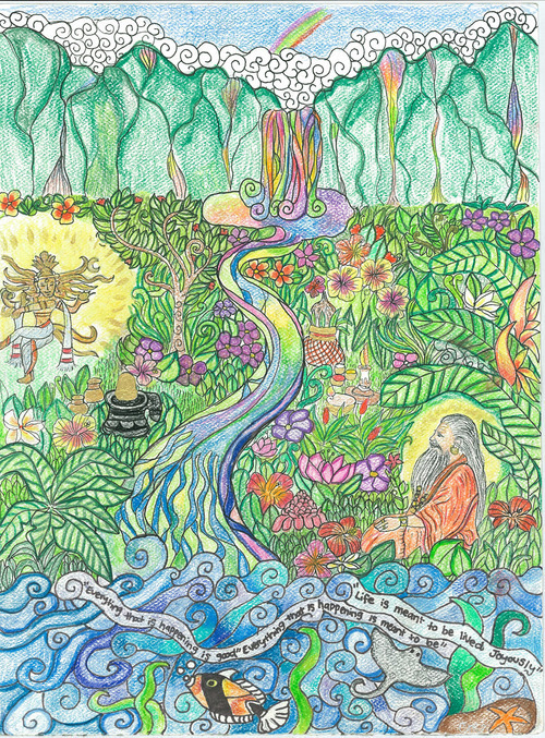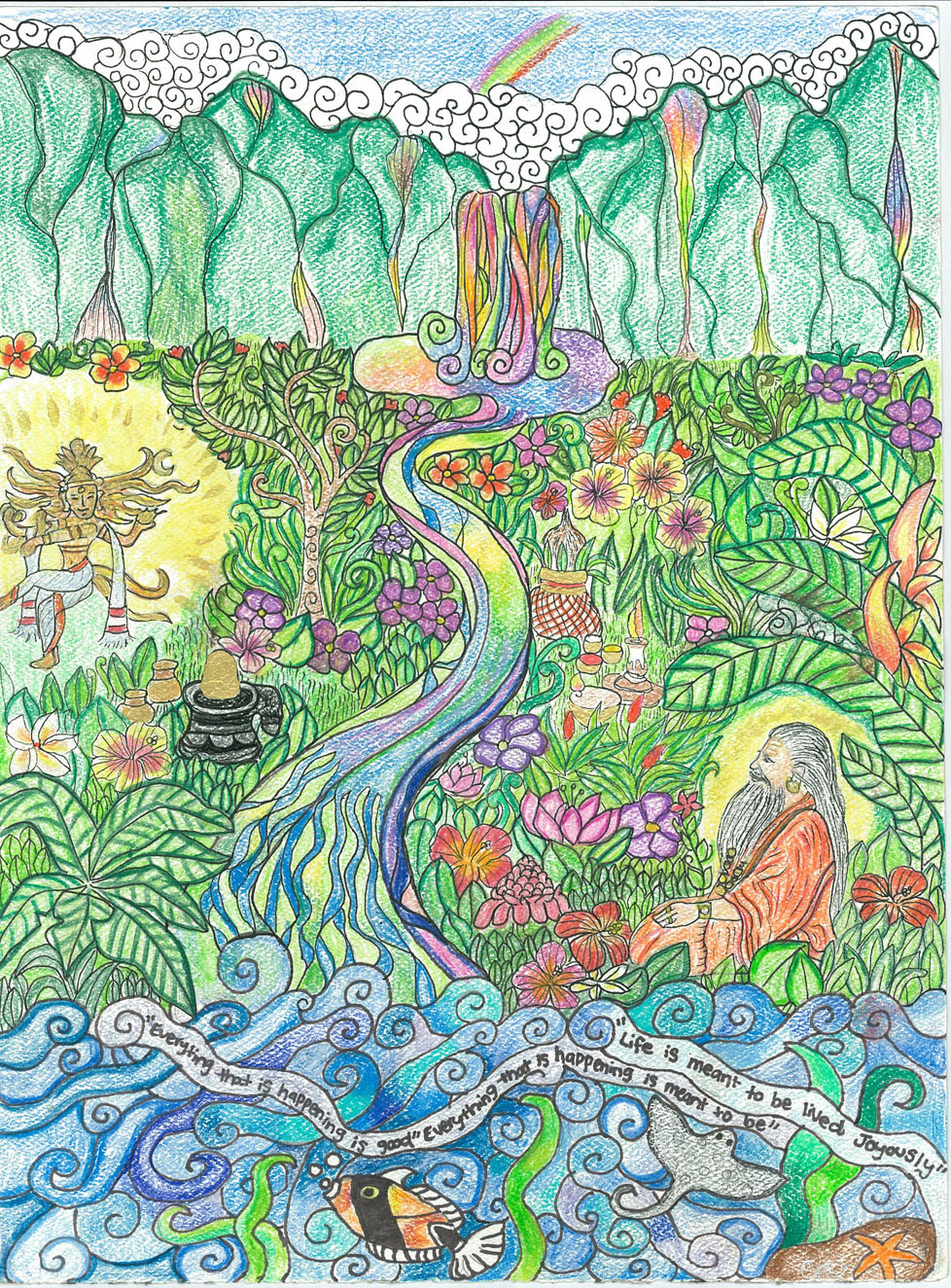 Palaniswami and Senthilnathaswami returned today, diving into the completion of the January issue of Hinduism Today, the archway gate completion and more. They brought back this delightful painting. It is Siva and Gurudeva, Kauai and Wailua, complete with the most creative rainbow waterfall cascading down the face of Mount Waialeale. It is the work of Chudika Mahadevan, and in case you can't read the ribbons, they say "Life is meant to be lived joyously" and "Everything that is happening is good. Everything that is happening is meant to be."
