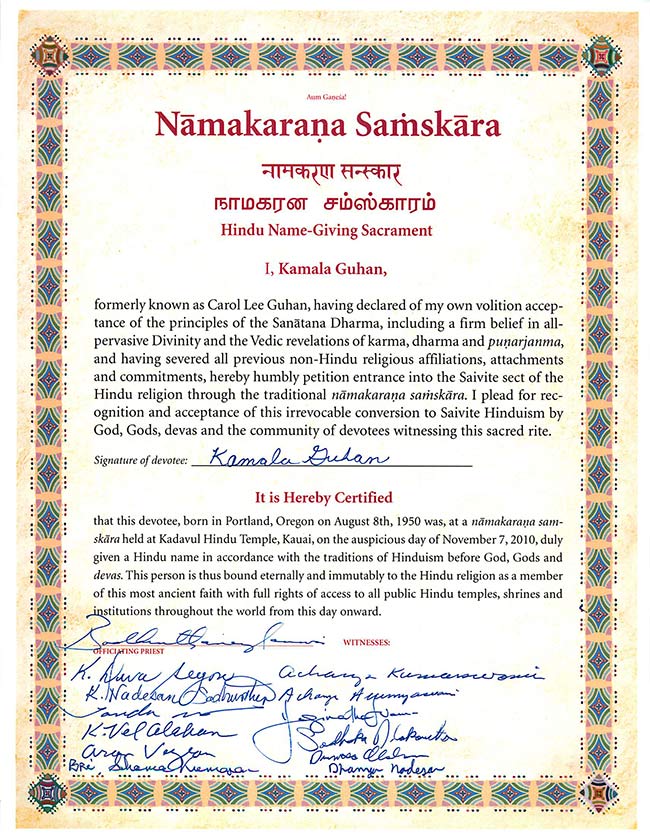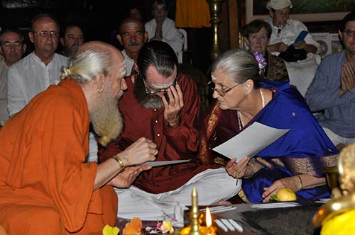Toshadeva Guhan and his wife Kamala, having completed their Level Two Master Course study, and legal name change have today received their Namakarana Samskara in Kadavul. Paramacharya Ceyonswami explains that they should read out the vows and pledge before the sacred fire and the congregation of devotees.