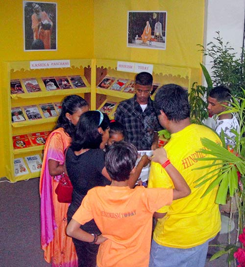 Here, dedicated volunteers Keith and his son, Dharma (in their Hinduism Today t-shirts), explain the contents of Himalayan Academy's Mystic Mouse to some youth. "Our staff learned more than the visitors. It was a most successful project," concluded Ashwinee.