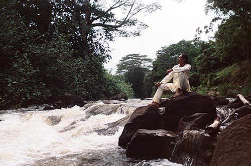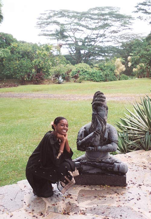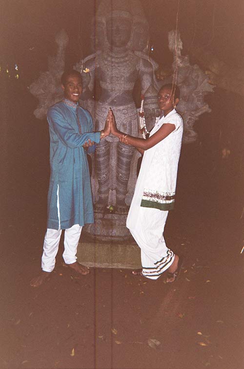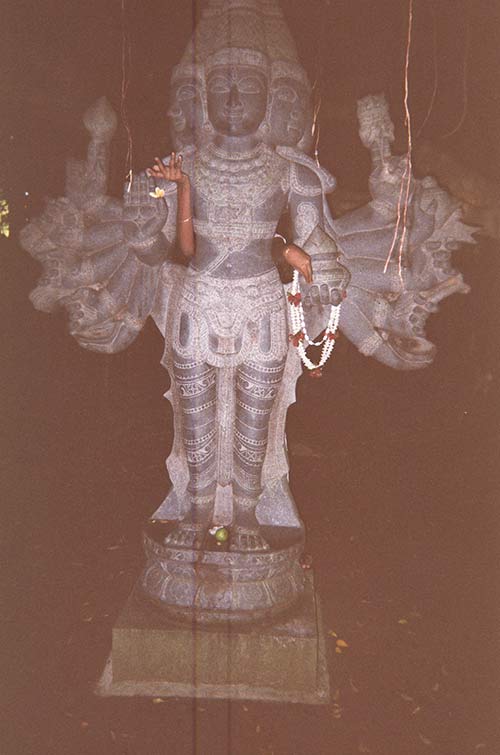 Lily is adds two more arms to help our outdoor statue of the Six-Faced Murugan with his lilas.