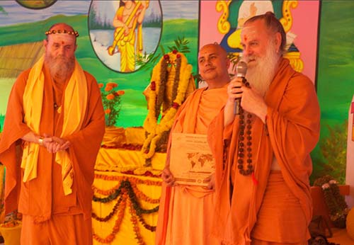 Paramacharya Palaniswami makes the formal presentation of the Hindu Renaissance Award to Dharma Ratna Shri Shri Swami Gopal Sharan Devacharya Maharaj, acknowledging his earlier acceptance of Hinduism Today's Hindu of the Year for 2009
