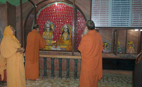 At nine Guruji invited us to sit with him for the abhishekam of a delightful ten-inch bronze of Nimbarkacharya, all in a circular marble clad chamber some fifteen feet in diameter. It is his private worship of the founder of the lineage.