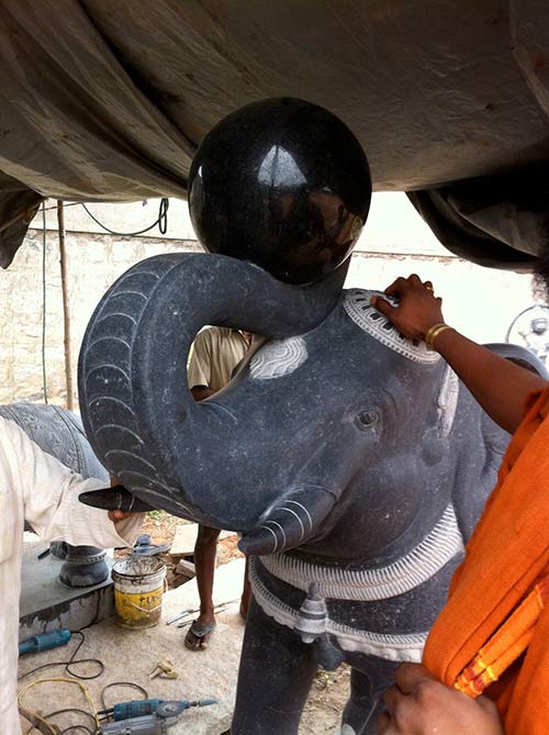 Yoginathaswami looking at the elephant destined for the steps of Iraivan temple, at the top of the hill from the river. A map of the Earth will be carved into the ball.