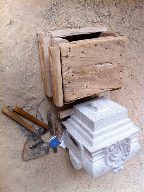Sitting on this makeshift stool, the silpi carves the intricate designs upon the stone.