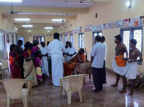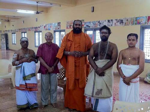 Meeting with Picchai Gurukal's son, standing to Yoginathaswami's left. This Gurukulam is one of the foremost priest training schools in South India.