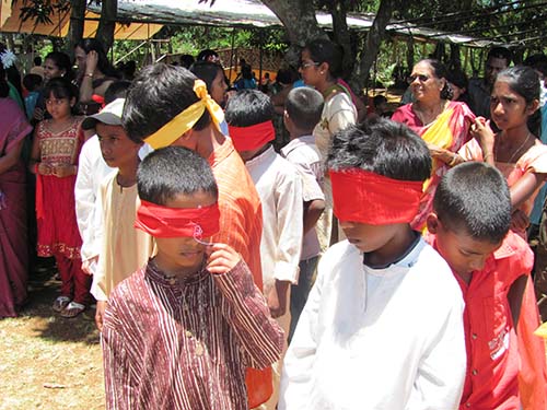 The boys blindfolded. In this game they had to collect water to fill containers which girls are holding...