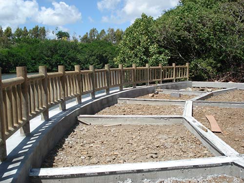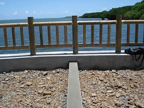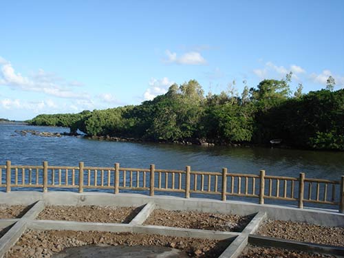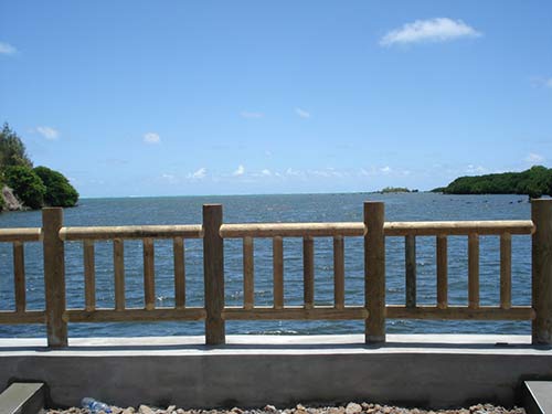 Giant platform at the river by our property in Mauritius is nearly complete, with a wooden railing installed.
