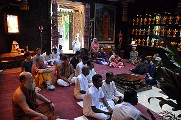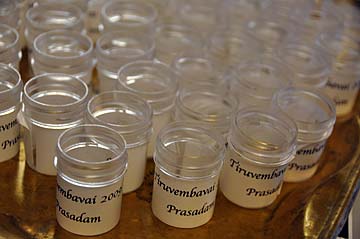 Yoginathaswami coordinated with about eight of the other monks who all worked hard for several days preparing a long list of abhishekam items and garlands for today's truly transcendent puja. Small containers are prepared in advance to hold the honey poured over the murthi during the puja, to share with devotees.