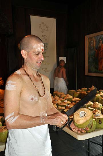 Sadhaka Tejadevanatha is back from his Sojourn in the World. 108 young coconuts were prepared in advance. This was just one of the items used for the bathing of Nataraja which went on for nearly an hour!