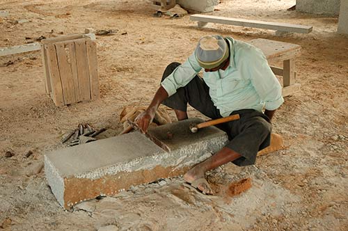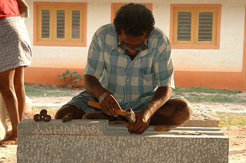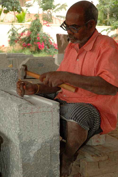 Silpi Segar carving the stone. Observe the markings on the right at the end of the stone. These are master guides which the silpis need to follow very carefully while carving all across the length of the beam