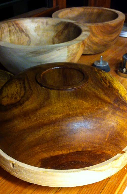 Here we have a couple of bowls in the background that have dried for a few months and are ready to put back on the lathe for final turning. I, the foreground we see a "jamchuck." This is used as a base to attach the bowl after the outside has been tools and sanded to its final form.