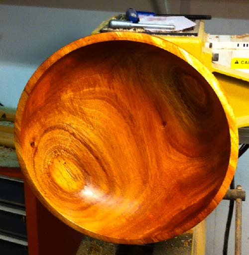 Here, we see the jam chuck with the bowl snuggly fitted on to it. Prior to this, the jam-chuck, made of pine in this case, was turned to the exact diameter of the inside of the bowl rim. Then the assembly was mounted on the lathe and the bottom was brought into final form, as seen in this picture.