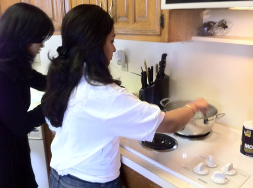 Sonal fries onions and spices for the dal in ghee we made on the spot. Our menu included brown rice, simple sambar, beans poriyal and paneer with spicy tomato gravy. (Thanks to Padmaja Patel for bringing homemade paneer all the way from Midland! Preparing the paneer alone would have taken an extra hour or two.) We only had an hour and a half, but we did it! Part of the idea was to show how easily and quickly a delicious, nutritious Indian meal could be created. Of course, cooking just for oneself or for a few others could be done in an even shorter period, maybe one hour. It beats frozen food or take-out!