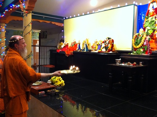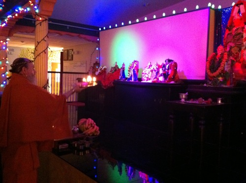 Part of the way through the arati, the main lights were dimmed and a wild multi-colored flashing light show transpired in the shrine!