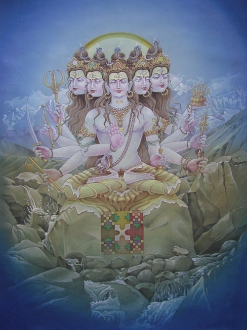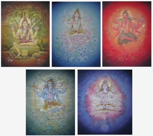 Another magnificent Siva, this one the sixth and final master work of art by Pieter Weltevrede of Amsterdam, sent this morning. He asked for Palaniswami's take on it, and here is what Paramacharya wrote: My reaction? You know what I think, but let me put inadequate words to it. First, thanks for placing the Agamic Mandala below Siva. It is an important and usually neglected one and bringing it forward like this will have an impact in the South Indian iconography world. In all of the works, you have achieved an ambience people are calling "sacred space" these days, a sense of a Divine presence and energy. You are gifted, so may not know how very difficult this is to accomplish. It must flow not from technique but from intuition, from deep within. I have discovered that we can only create from what we are, and that you can call forth through your brushes an image that is sacred and full of shakti speaks of your own spiritual depth. Yes, I'm thrilled with the series and know when it reaches our magazine later this year it will be marveled at. For details: thanks for the kundala (earrings) and the geometrical shapes and colors, a subtle but, for us, meaningful touch. The slightly tilted Siva and mandala are effective, surprisingly so for so little angle. The outstanding details have to be Siva's hair and implements (check out that pot of fire), the dancing nagas, the color swath through the center, breaking apart the Himalayas and the nascent Ganges below. In fact, the waters dropping down like that surprised me, such a bold move, symbolically making Siva the Source of the Ganges (and thus the source of All and Everything), and dropping the viewer into a rock and water space below, nothing to support us but the unimaginable waterfall that crashes to Earth below us, bringing Life and Sustenance and Destruction all at once. Well done!