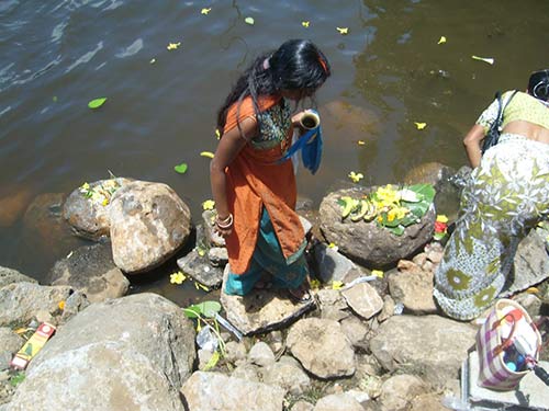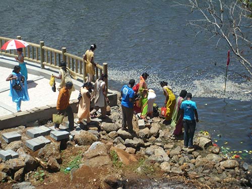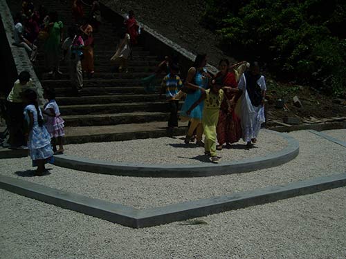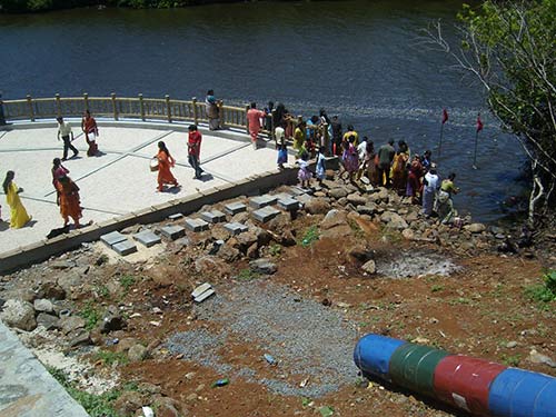 The contractor is now finishing a path to the river , on the right hand side when facing the river, for pilgrims to collect river water and offer arati.