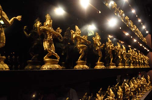 The temple is scintillating with lights over dancing tandavas reflected in the mirrors
