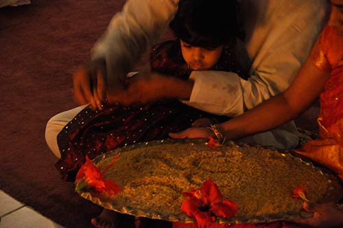 The little girl writes her first word, AUM in the tray of rice which is offered to the fire.