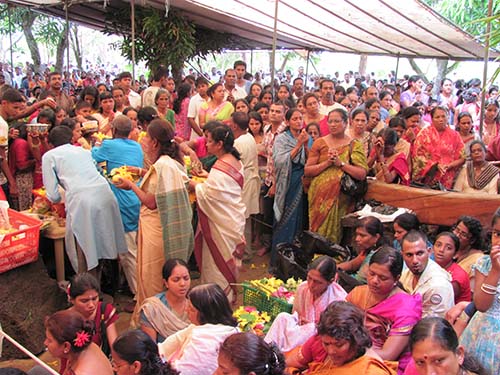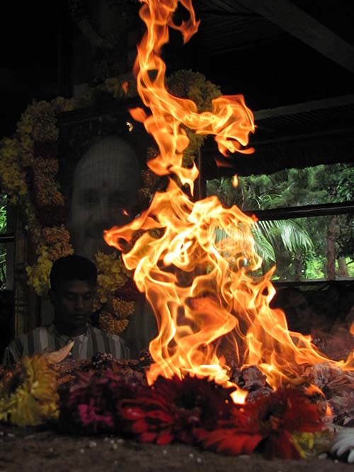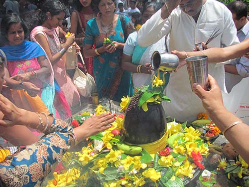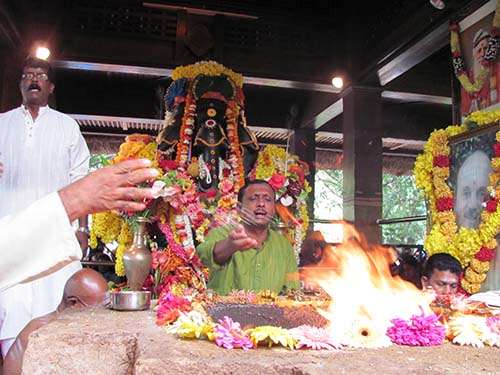 Worship at the Siva Lingum with water and flowers goes on all through the ceremony.