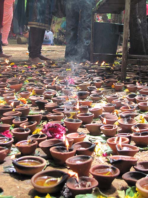 Hundreds of lighted earthen oil lamps are placed near the small Ganesha Mandapam.