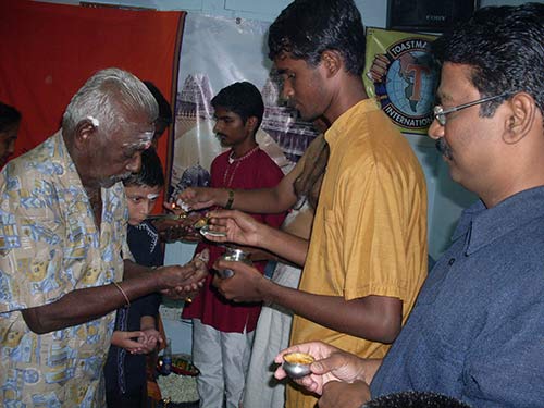 Having vibhuthi prasadam. This elder from the community attended the satsang session. He shared his view on "Will Power" Gave a long an explanation and finally said he was very impressed to see our satsang prayers.
