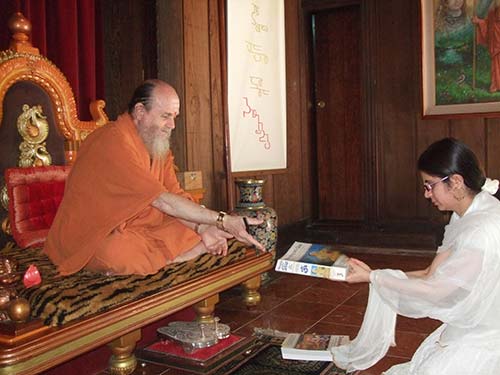 Bodhinatha signs Namrata Ragade's copy of Merging with Siva. Namrata and her family visited from their home in Portland, Oregon in December. She has returned on pilgrimage for several days to do some sadhana and meditation.