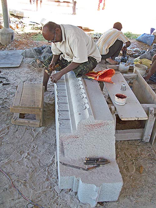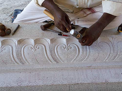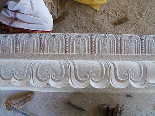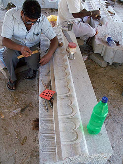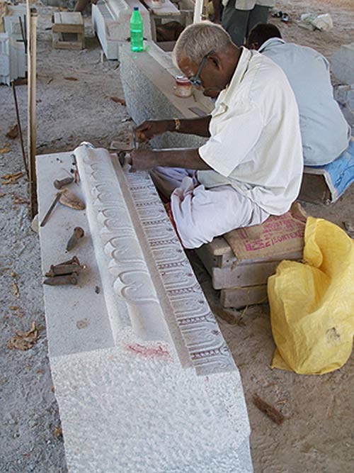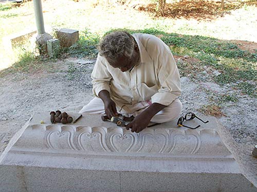 Sankaran working on the lower portion of the beamstone. The ornamental carving is different.
