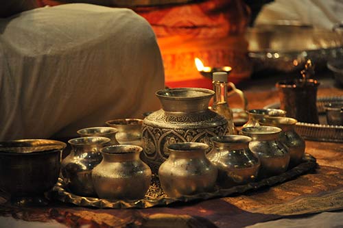 The kumbhas here arrayed, filled with precious substances for the abhishekam.