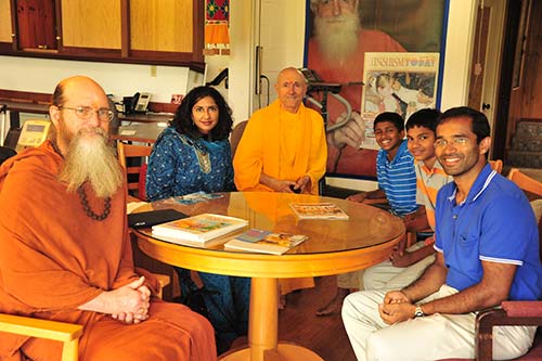 Dr. Raj K. Mathuri visits with his wife Deepa and two sons. They chat with Arumugaswami about our two new children's books which are a perfect fit for the boys.