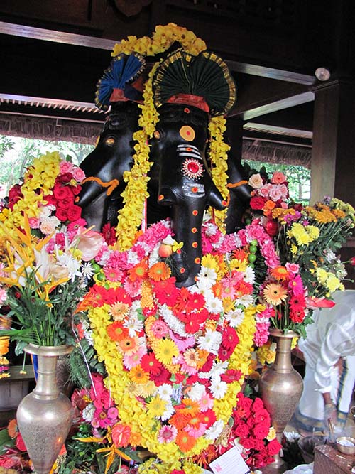 Here too Lord Ganesha is highly decked with homemade garlands lovingly woven by families.