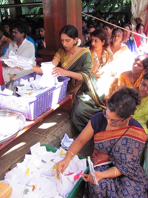 Our ladies arranging piles of written prayers that would be sent into the sacred fire.