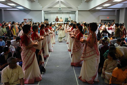 It was a beautiful welcome for Bodhinatha. The group was so excited. All the Bal Vihar teachers, who wear beautiful red and white saris, held candles while Bodhinatha, the priest and several musicians walked past toward the stage.
