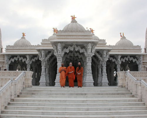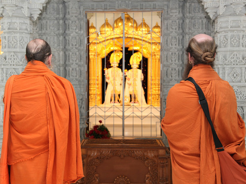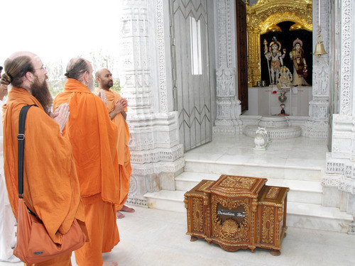 Here Bodhinatha and Senthilnathaswami worship the main Deities of this temple, Bhagwan Purushottam Swaminarayan (1781-1830), the founder of the Swaminarayan parampara, and his successor, Shri Aksharbrahma Gunatitanand Swami (1785-1867). This lineage carries forward with unbroken continuity, today with 862 sadhus and over a million devotees worldwide.