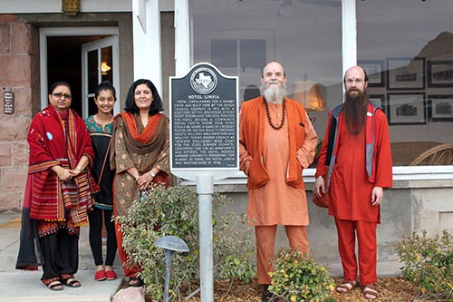 Jigisha (Mrunal's sister), Pooja and Padmaja pose with Bodhinatha and Senthilnathaswami next to a historical marker outside the entrance to the hotel.