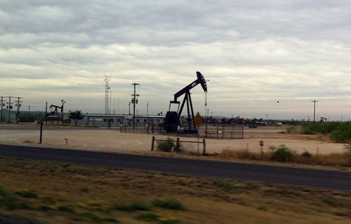 A drive through West Texas is never complete without seeing hundreds, or rather thousands, of oil wells, marked with pumpjacks like this one, as well as natural gas fracking sites (which give off the most terrible smells!). The night sky is marked by oil drilling rigs that look like light towers. Such 24/7 drilling operations cost $2-3 million a piece, and each one is a gamble. The flat Permian Basin is one of this country's largest oil fields. It's all about the black gold here in Midland.