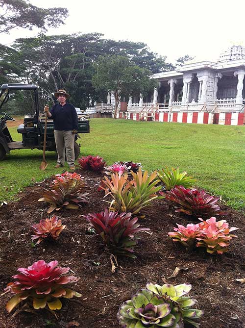 Vel Alahan works near Iraivan, making a new mound of bromeliads. His karma yoga is helping with the landscaping of Kauai's Hindu Monastery. Thank you, Vel!
