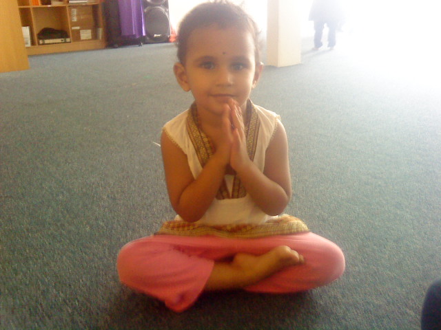 "Please bless our food," prayed little Raanya in her half lotus position.