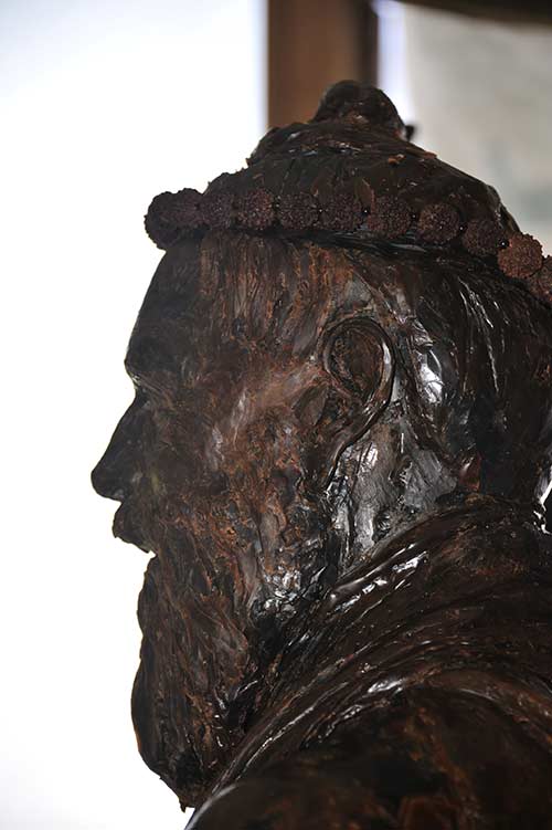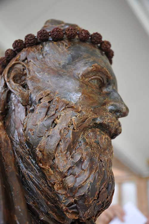 In the finished bronze, the Rudrakshas will be in metal, they are here just to show the overall effect. The hair and beard are not finished, just roughed in.
