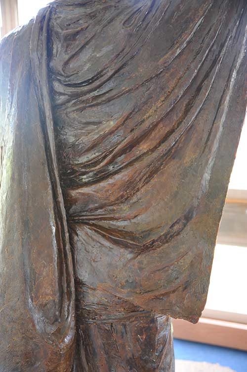Holly is working on the satguru's khadi robes, capturing their folds. She has a plan to take a tiny rake (about one inch side with 15-20 teeth) and go vertical and then horizontal over the entire murthi, creating the look of weaving in the bronze!