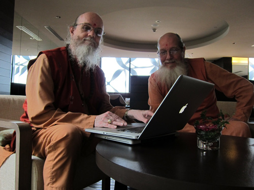 Bodhinatha and Shanmuganathaswami arrived safely in Singapore on May 23 after 24 hours of travel. Their multi-purpose visit to Asia is focusing on meeting with members, students and business associates. Here they are reviewing a memorandum of understanding for printing Hinduism Today in India.